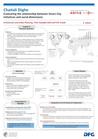 By its virtue of being a theme-in-action, resilience is expected to be the foundation of urban development now and in the future. In an urban setting, infrastructure forms the backbone of development and hence it is essential to identify and develop critical infrastructures to be resilient and prepared for emergency situations. With urbanization occurring rapidly and being an irreversible process, cities need to be the prime focus for intervention. The Smart City concept has attracted world interest and has been a topic of discussion of the current decade. With its association to ICT and the debate around its benefits and drawbacks, this thesis aims to study the evidence of social influence on technological infrastructures and vice versa through the Smart City initiatives in India and Singapore. It aims to study the role of contextual specificity in the formulation of their agendas and strategies along with testing the ‘digital readiness’ of the communities. A case-study based approach will be adopted to study and analyse the different approaches chosen by the two nations to achieve their social, economic and environmental goals. The results of the study aim to promote 'socially induced innovation' as a pillar to develop critical (technological) infrastructure.